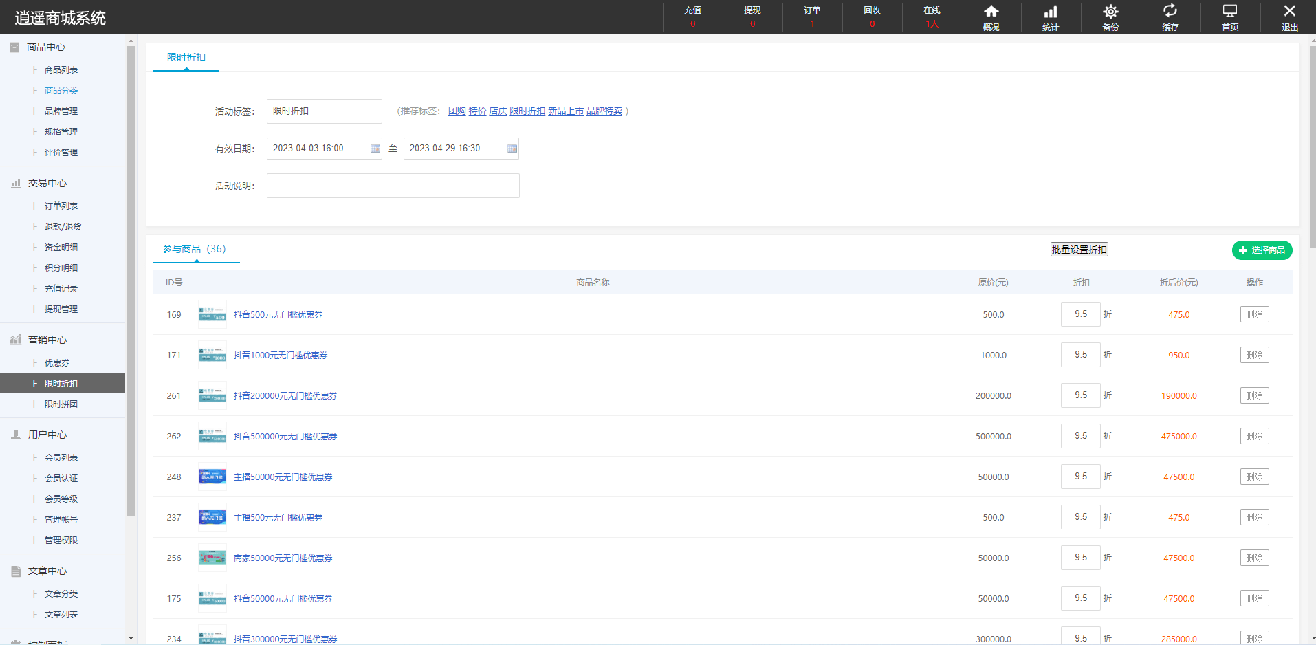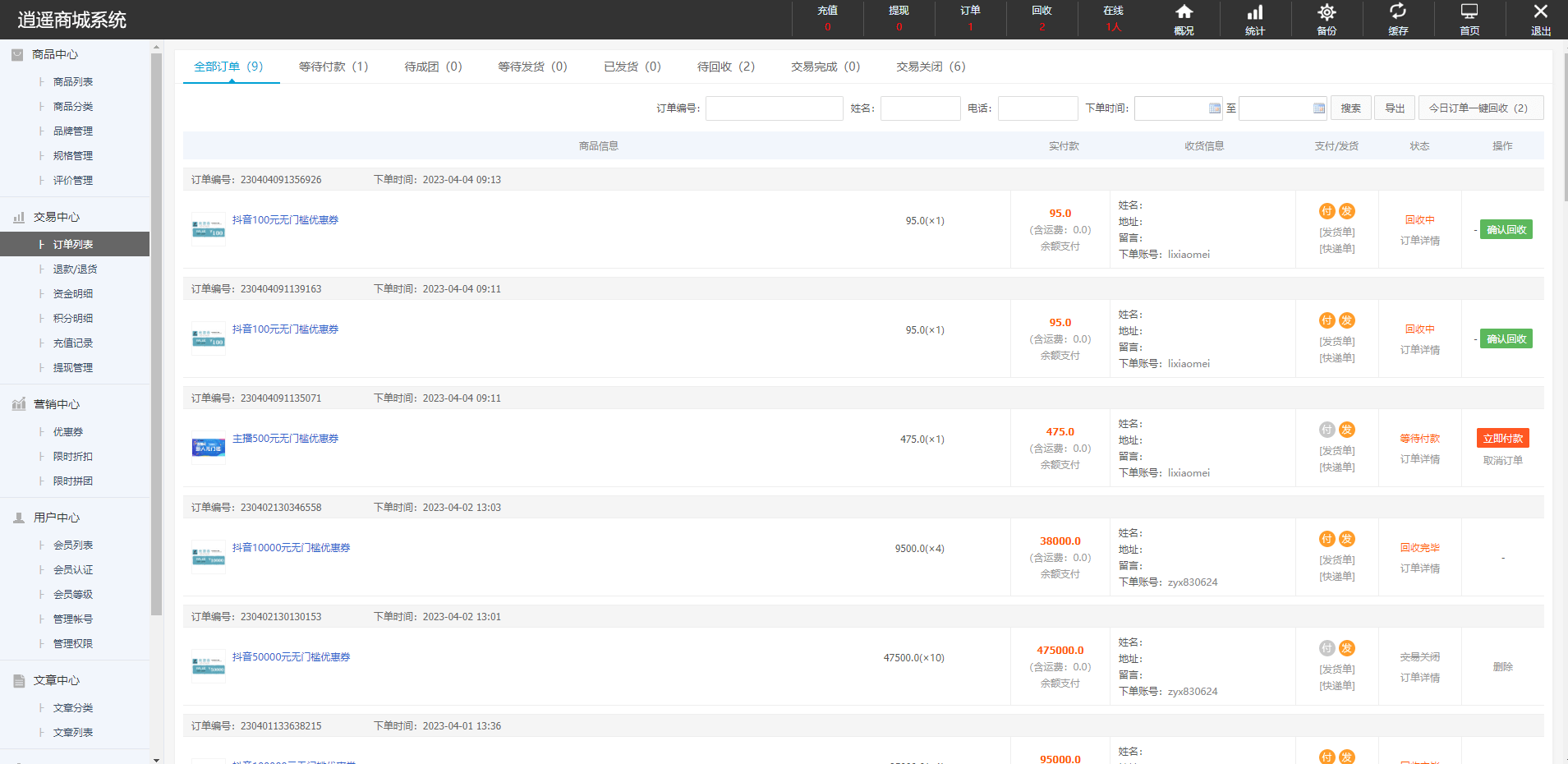系统是基于逍遥商城二开的系统,pc手机端都新增了邀请码验证 手机端重新定制的UI,前端产品不至于抖音卷也可以自行更改其他产品 用户前端下单,后台订单可以直接回收,后台支持设置默认邀请码和抢卷时间限制 声明:本站所有文章,如无特殊说明或标注,均为本站原创发布。任何个人或组织,在未征得本站同意时,禁止复制、盗用、采集、发布本站内容到任何网站、书籍等各类媒体平台。如若本站内容侵犯了原著者的合法权益,可联系我们进行处理。